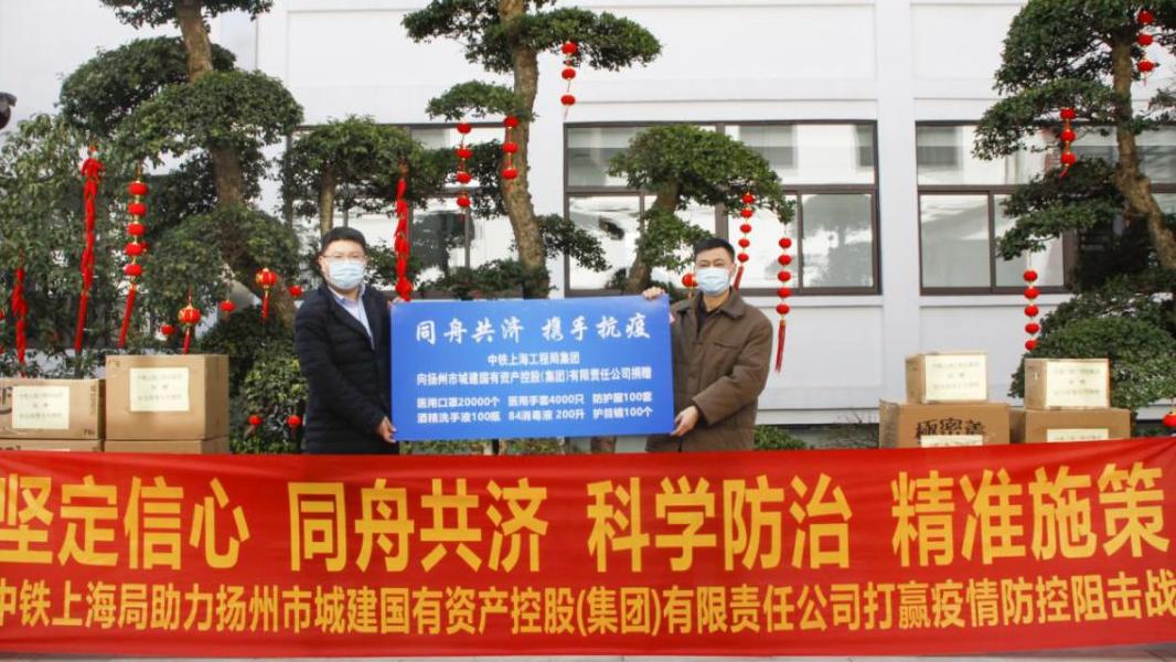 捐贈儀式上,中鐵上海工程局集團(tuán)華海公司共向城控集團(tuán)捐贈醫(yī)用口罩20000個、醫(yī)用手套4000只、防護(hù)服100套、酒精洗手液100瓶、84消毒液200升、護(hù)目鏡100個。