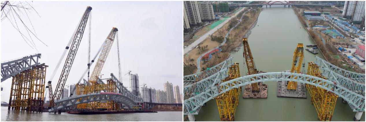 跨京杭運河大橋拱肋部分的合龍段共有三節,其中含兩節對稱的邊拱中跨合龍段,一節中拱中跨合龍段。本次吊裝的是跨京杭運河大橋合龍段的首節,長82.2米,高17.4米,重282.4噸。截至目前,項目主體工程已完成65%。