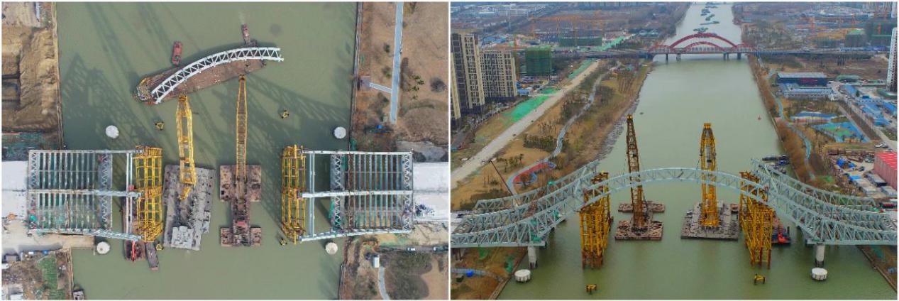 1月16日,萬福快速路跨京杭運河大橋拱肋首節合龍段順利吊裝,大橋初現剛柔并濟的精美弧線造型。
