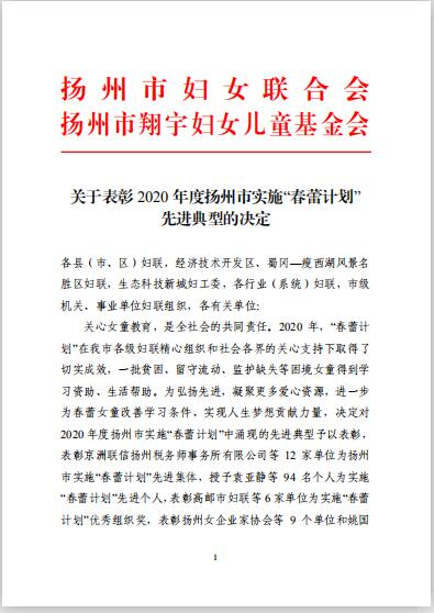 近日,揚(yáng)州市婦聯(lián)發(fā)布《關(guān)于表彰2020年度揚(yáng)州市實(shí)施“春蕾計(jì)劃”先進(jìn)典型的決定》。城控集團(tuán)被表彰為“愛(ài)心大使”榮譽(yù)稱號(hào)。