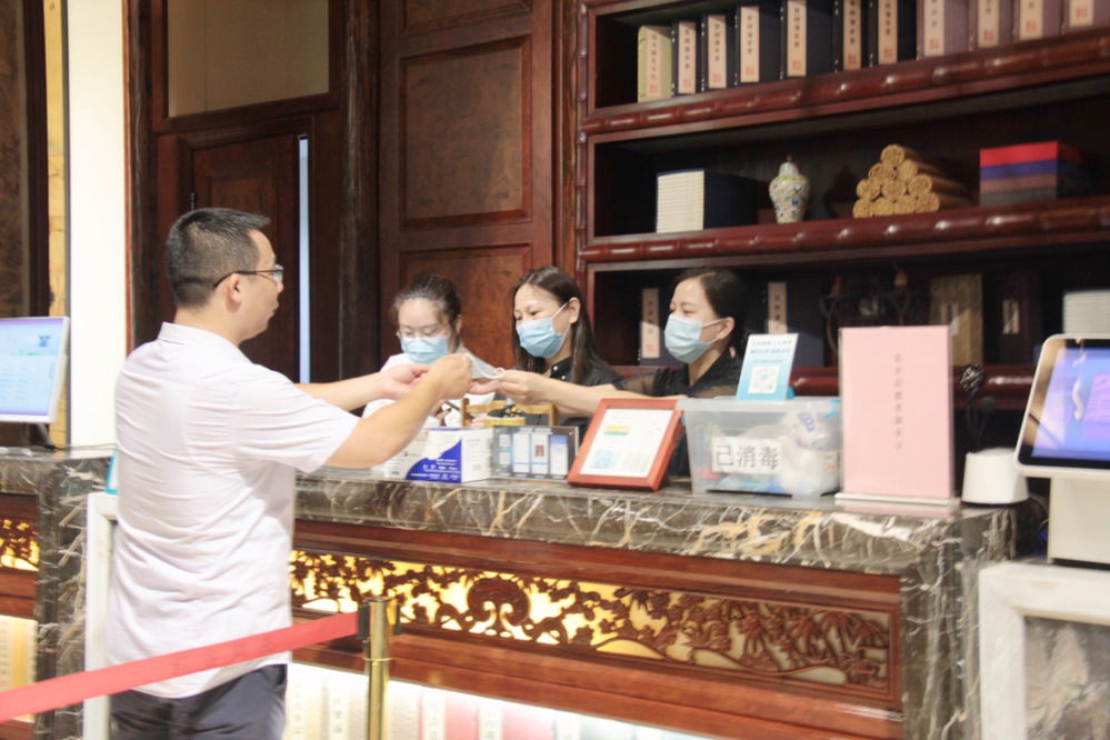 長樂客棧大堂作為旅客辦理入住和退房的公共區域,客流量較大,屬于疫情防控的第一道關口。為做好來店人員排查和信息登記工作,志愿者們充分發揮黨員帶頭作用,同前廳大堂工作人員一道對來店旅客進行檢測體溫、查驗蘇康碼和行程碼以及發放口罩,第一時間向旅客們宣傳疫情防控有關注意事項。