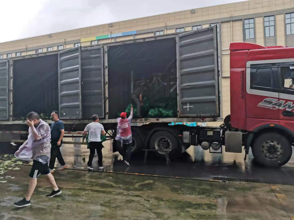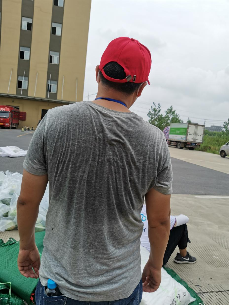 14:30,天空開始飄起雨點,大家依舊堅守在各自的崗位上,很快雨點就打濕了衣服和頭發,可現場沒有一個人退下躲雨。“這車卸得差不多了,我們去那邊幫忙”,“邗江區轉運蔬菜的車來了,需要10個人裝車”,“我去”“我也去”,現場只有時不時這樣的聲音傳來。