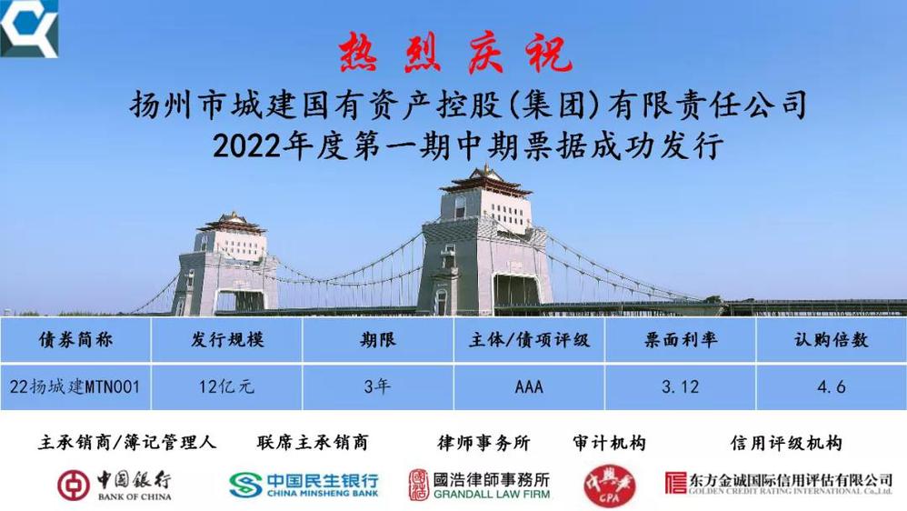 1月11日,城控集團2022年第一期12億元中期票據成功簿記發行,期限3年,獲市場4.6倍超額認購,最終票面利率3.12%,創揚州城控集團同期限債券產品發行利率新低,這充分體現出資本市場對集團發展的高度認可,也為集團提升資本市場形象再續新篇。