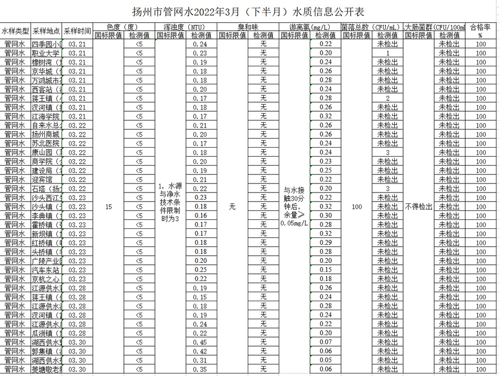 揚州市管網水2022年3月(下半月)水質信息公開表