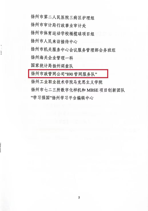 近日,市婦聯(lián)、市婦女“巾幗建功”活動領(lǐng)導(dǎo)小組聯(lián)合表彰了一批揚(yáng)州市“巾幗文明崗”和“巾幗建功標(biāo)兵”。揚(yáng)州市政管網(wǎng)有限公司“890管網(wǎng)服務(wù)隊(duì)”榮獲“巾幗文明崗”稱號。