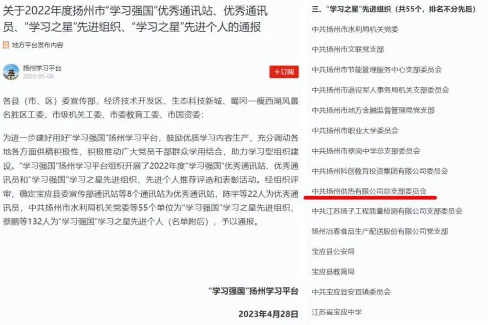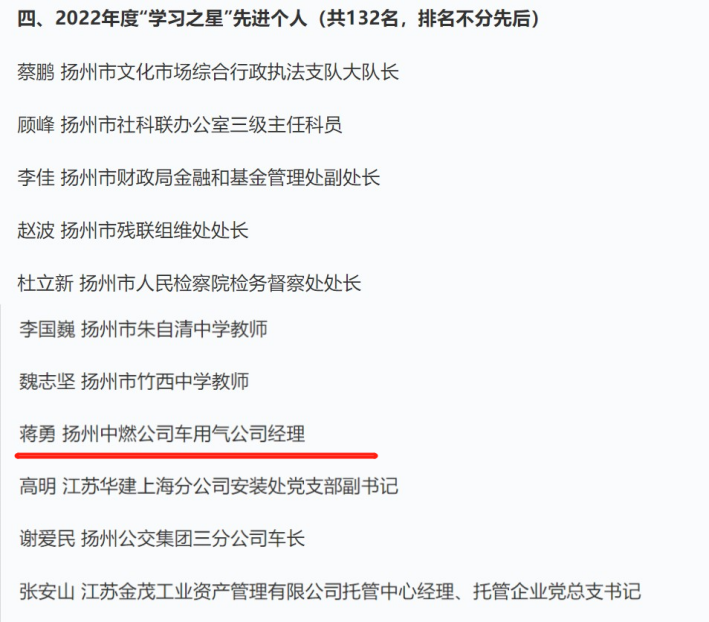 近日,“學(xué)習(xí)強(qiáng)國”揚(yáng)州學(xué)習(xí)平臺發(fā)布了《關(guān)于2022年度揚(yáng)州市“學(xué)習(xí)強(qiáng)國”優(yōu)秀通訊站、優(yōu)秀通訊員、“學(xué)習(xí)之星”先進(jìn)組織、“學(xué)習(xí)之星”先進(jìn)個人的通報》,集團(tuán)下屬供熱公司黨總支被表彰為2022年度揚(yáng)州市“學(xué)習(xí)強(qiáng)國”“學(xué)習(xí)之星”先進(jìn)組織、揚(yáng)州中燃公司蔣勇被表彰為“學(xué)習(xí)之星”先進(jìn)個人榮譽(yù)稱號。