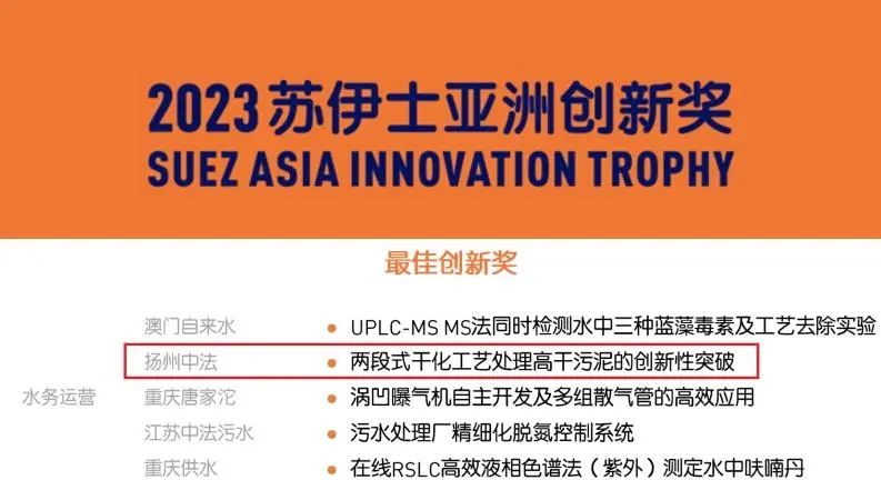 近日,揚州中法環(huán)境“兩段式干化工藝處理高含固率污泥”項目因創(chuàng)新程度高、實用性強等特點獲得了中國創(chuàng)新方法大賽優(yōu)勝獎和2023年度蘇伊士亞洲最佳創(chuàng)新獎。