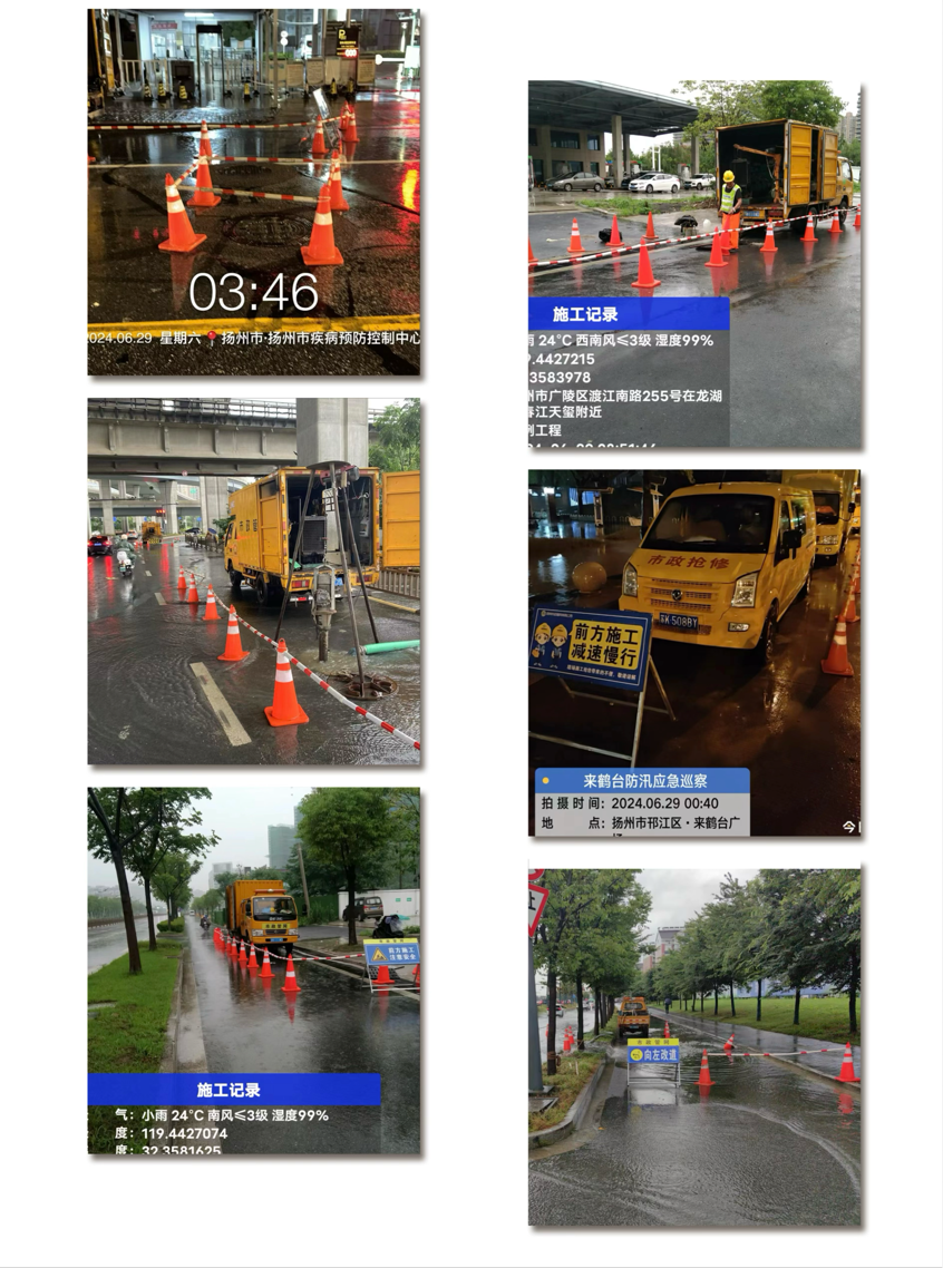 其中,邗江北路與文昌路交叉口(來(lái)鶴臺(tái))和邗江北路海德公園門口兩處責(zé)任積水點(diǎn)安排專人和應(yīng)急車輛前置值守。對(duì)管轄范圍內(nèi)江平路和揚(yáng)子江北路交叉口、江平路和潤(rùn)揚(yáng)北路交叉口、渡江南路、上方寺路、揚(yáng)州天下、蘇北醫(yī)院西門、大官橋路、朱塘路等易滿溢點(diǎn)進(jìn)行全天候不間斷巡查。