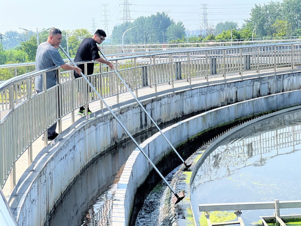 他是不服“暑”的清潔者。每上午九點(diǎn)是污水廠運(yùn)行班組的巡查時(shí)間,這時(shí)戶外的實(shí)時(shí)氣溫已高達(dá)38度,沙班長(zhǎng)沿著巡查線路,從進(jìn)水泵房、二沉池、生物池、高效沉淀池等,巡視著各點(diǎn)位的運(yùn)行情況;做污泥沉降比,及時(shí)掌握污泥性能。在巡查過(guò)程中需要不停地上池下池,整個(gè)巡查過(guò)程幾乎都是靠步行來(lái)完成,等到結(jié)束所有工作,衣服浸透已是一種習(xí)慣,這是運(yùn)行班工作人員每天都要進(jìn)行的一項(xiàng)工作。高溫使得二沉池上的浮萍生長(zhǎng)速度加快,沙班長(zhǎng)便帶領(lǐng)組員上池子,頂著烈日用鏟子的將浮萍一點(diǎn)點(diǎn)鏟除,汗水劃滿泛紅的臉頰,衣服早已濕透,后背留下了一道道白色的鹽霜,但是他們的腳步卻從未移動(dòng)半分,直至浮萍徹底清除干凈。
