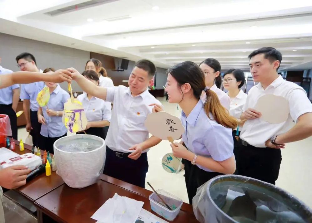 以漆為筆,以水為墨。揚州中燃公司現場邀請所有參加人員,動手體驗非遺漆扇的魅力。大家在挑選了心儀的顏色后,在老師的指導下,將稀釋好的色漆小心翼翼地滴灑在水面上進行設計制作,將白色扇面緩緩浸入水中,或旋轉、或搖擺,一把把意蘊悠長的漆扇給大家帶來了不少的驚喜。
