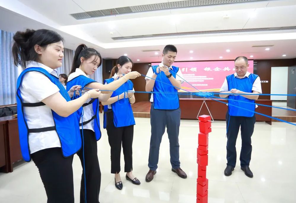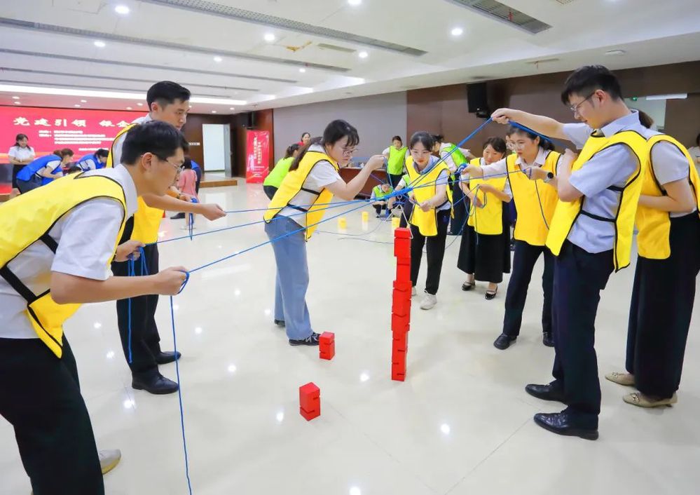 此次共建活動在歡快輕松的氛圍中進行,為充分調動大家的參與熱情,在主持人熱情地引導下,大家首先進行了熱身。熱身活動后,揚州中燃公司和三家銀行組建三支團隊依次開展“環游世界八十天”、“達芬奇密碼”、“聯合攻城”等一系列團隊協作競賽。大家在競賽互動中不斷磨合,增強了彼此之間的信任感和團隊凝聚力。“聯合攻城”作為競賽環節的最后一個項目,將現場的氣氛推到一個高潮。“聯合攻城”需要隊員們同時操控手中的繩子,利用三角形的鉤子,將現場的八塊積木堆積成一個柱子,堆積過程中手不可觸碰積木,且柱子不倒塌視為完成競賽,用時最少的隊伍獲勝。這項競賽既考驗了隊員們之間的團隊協作能力,又考驗了每一位隊員的心理素質和應對能力,大家在團結緊張活潑的氣氛中感受著充滿挑戰競賽過程和完成項目的喜悅。