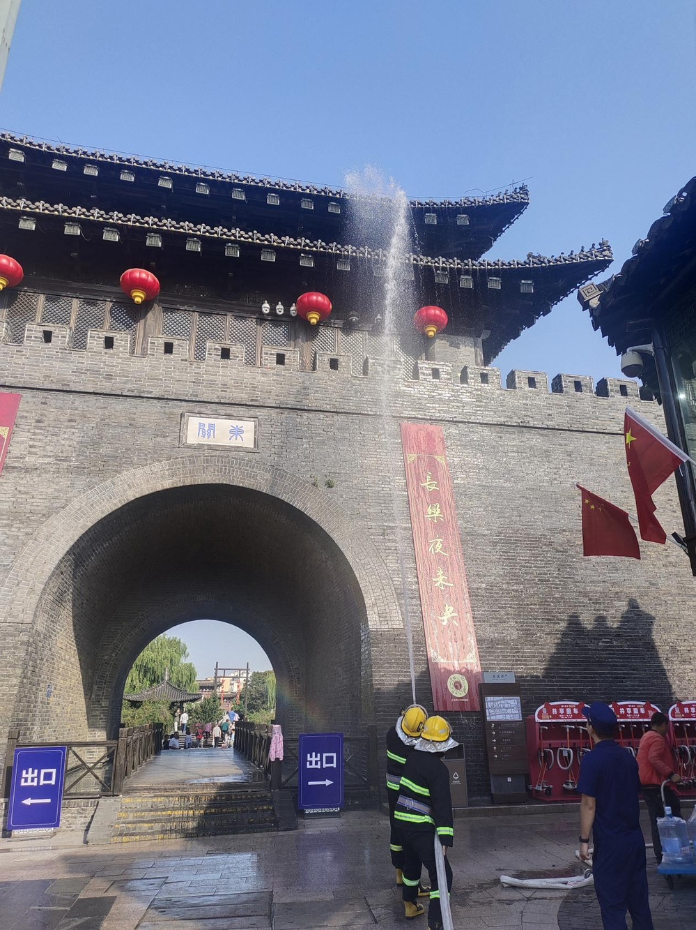 此次演練以實(shí)戰(zhàn)的角度出發(fā),測(cè)算水帶干線的鋪設(shè)距離、水槍陣地設(shè)置、力量部署、車輛的位置停靠等信息。演練前,安保人員再次對(duì)消防通道、室外消火栓布局、水源分布、電源位置等情況逐一查看。隨后,模擬街區(qū)最高點(diǎn)城門樓重檐頂部起火,根據(jù)前期制定的滅火救援方案從多角度、多位置對(duì)火災(zāi)位置進(jìn)行滅火救援,演練過(guò)程中個(gè)個(gè)精神飽滿,安保人員配合默契,動(dòng)作準(zhǔn)確迅速,圓滿完成了此次演習(xí)任務(wù)。通過(guò)開(kāi)展此次針對(duì)性的培訓(xùn)演練,擰緊了街區(qū)安保和附近商戶的“安全弦”,加強(qiáng)了街區(qū)消防安全處置能力,提升了安保滅火救援實(shí)戰(zhàn)能力,為東關(guān)街安全生產(chǎn)工作提供了更好的保障。