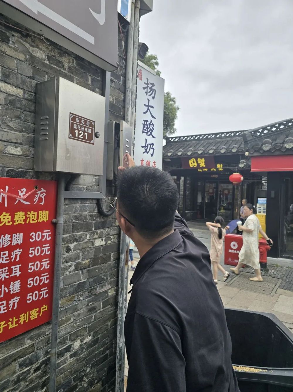 上午10點,地表溫度突破40℃。魯毅的工作服已濕透,他正蹲在一家文創店后巷,檢查私拉電線給電動車充電的問題。“小李,這線路像蜘蛛網一樣,臺風一來準出問題。”他耐心解釋,并協助店主聯系專業電工重新布線。此時,對講機響起:“街區東門入口客流較大,需要密切關注!”魯毅立即調轉方向,通過智慧平臺調度保安分流人群,同時用擴音器提醒游客:“前面石板路滑,請靠右行走!”